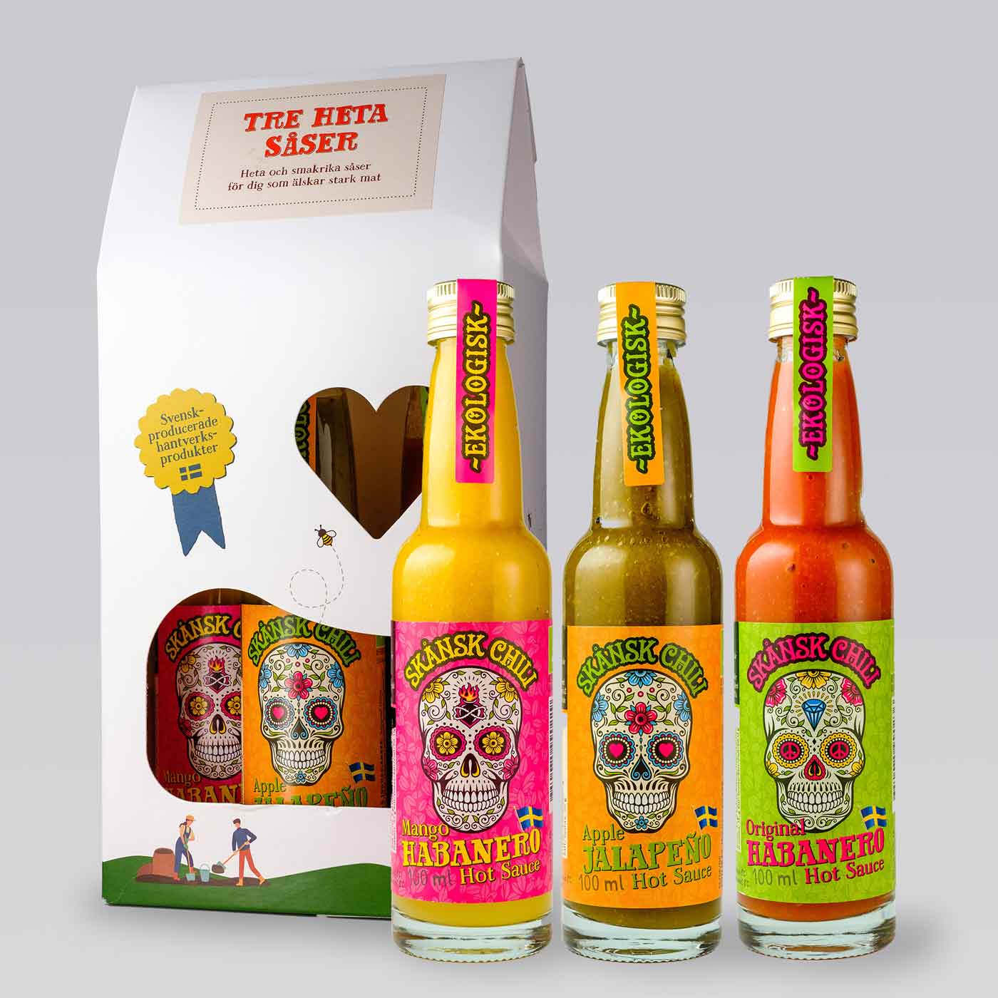 Denna presentförpackning innehåller tre av Skånsk Chilis mest omtyckta såser, i generösa 100 ml-flaskor. Alla är ekologiska, hantverksmässigt framställda och packade med naturlig smak.