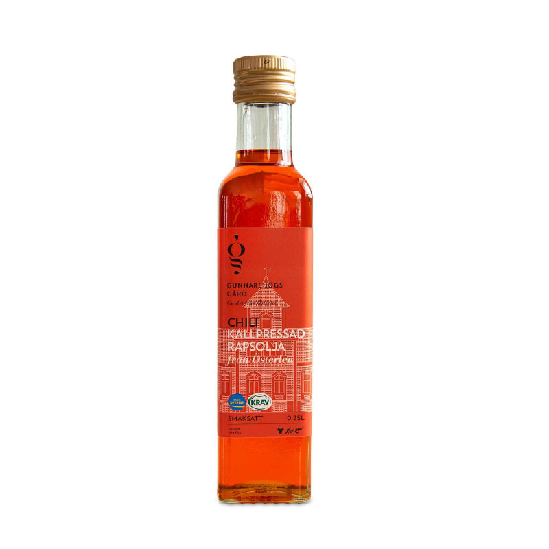 Gunnarshögs Gård, belägen i hjärtat av Österlen, är en familjeägd gård med en stark tradition av hållbar och ekologisk odling. Med en passion för kvalitet och smak, producerar de några av Sveriges bästa rapsoljor. Alla deras produkter är framställda med största omsorg för både miljö och smakupplevelse, och den ekologiska chilioljan är inget undantag.